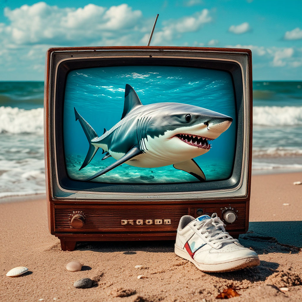 A vintage TV on the beach displays a vivid shark image, with a sneaker and seashells scattered in the sand nearby.